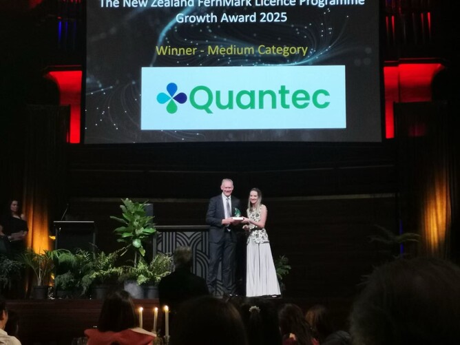 Quantec CEO John Dawson accepting the award from Jessica Guthrie, Fernmark Engagement Manager at New Zealand Story Group